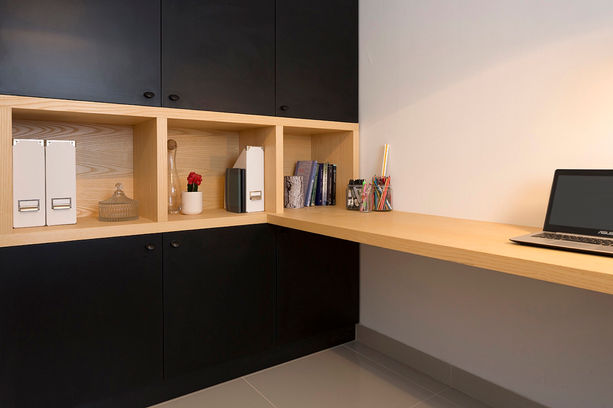 עיצוב חדר עבודה עם הרבה מקום לאחסון ושילובו עם חדר אורחים מסודר.